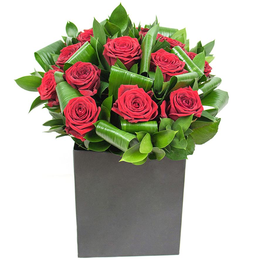 Experience the timeless beauty of our red rose bouquet, elegantly paired with aspidistra leaves and ruscus. This unique composition elevates any space with its vibrant colors and sophisticated design, making it an ideal gift for any occasion.